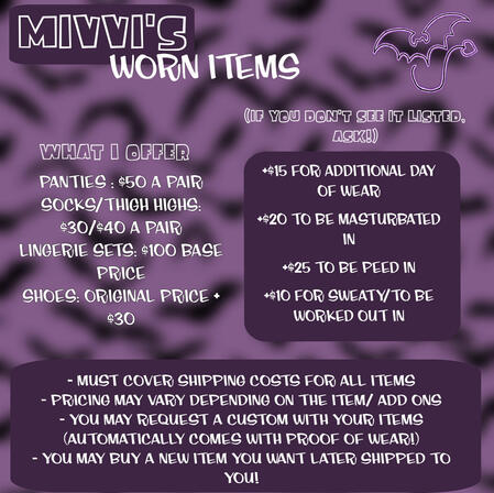 ♡ i reserve the right to deny any requests if they make me uncomfortable ♡Depending on the complexity of your request, there may be additional costs (call it Miv’s inconvenience fee)do not request a service (ex: video dick rates, I don’t offer this) and pretend it’s a custom. it’ll be a noI Do Not Offer/Will Not Do: fansigns with usernames, (nsfw) calls, video dick rates, sc@t, raceplay, ageplay, real bl00d,
